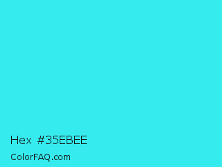 Hex #35ebee Color is a normal cyan color and the nearest color is Turquoise #40e0d0. Hex code #35ebee and RGB value is rgb(53,235,238). In RGB color space, this color is composed of 21% red, 92% green, 93% blue, In CMYK color space, this color is composed of 78% cyan, 1% magenta, 0% yellow , 7% black , In HSL color space, this color has a hue angle of 181° , 84% saturation and 57% lightness.