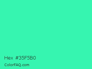 Hex #35f5b0 Color is a normal green color and the nearest color is Eucalyptus #44d7a8. Hex code #35f5b0 and RGB value is rgb(53,245,176). In RGB color space, this color is composed of 21% red, 96% green, 69% blue, In CMYK color space, this color is composed of 78% cyan, 0% magenta, 28% yellow , 4% black , In HSL color space, this color has a hue angle of 158° , 91% saturation and 58% lightness.