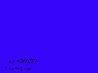 Hex #3605fa Color is a normal indigo color and the nearest color is Electric Ultramarine #3f00ff. Hex code #3605fa and RGB value is rgb(54,5,250). In RGB color space, this color is composed of 21% red, 2% green, 98% blue, In CMYK color space, this color is composed of 78% cyan, 98% magenta, 0% yellow , 2% black , In HSL color space, this color has a hue angle of 252° , 96% saturation and 50% lightness.