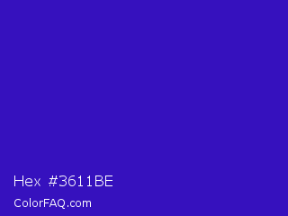 Hex #3611be Color is a normal indigo color and the nearest color is Interdimensional Blue #360ccc. Hex code #3611be and RGB value is rgb(54,17,190). In RGB color space, this color is composed of 21% red, 7% green, 75% blue, In CMYK color space, this color is composed of 72% cyan, 91% magenta, 0% yellow , 25% black , In HSL color space, this color has a hue angle of 253° , 84% saturation and 41% lightness.