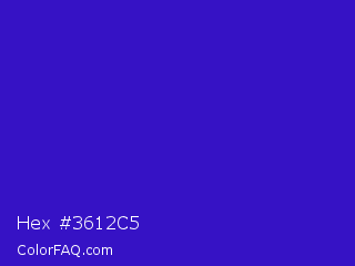 Hex #3612c5 Color is a normal indigo color and the nearest color is Interdimensional Blue #360ccc. Hex code #3612c5 and RGB value is rgb(54,18,197). In RGB color space, this color is composed of 21% red, 7% green, 77% blue, In CMYK color space, this color is composed of 73% cyan, 91% magenta, 0% yellow , 23% black , In HSL color space, this color has a hue angle of 252° , 83% saturation and 42% lightness.