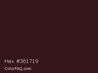 Hex #361719 Color is a very dark red color and the nearest color is Tamarind #341515. Hex code #361719 and RGB value is rgb(54,23,25). In RGB color space, this color is composed of 21% red, 9% green, 10% blue, In CMYK color space, this color is composed of 0% cyan, 57% magenta, 54% yellow , 79% black , In HSL color space, this color has a hue angle of 356° , 40% saturation and 15% lightness.