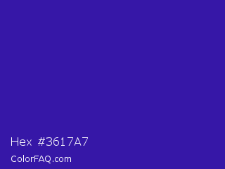 Hex #3617a7 Color is a normal indigo color and the nearest color is Blue Gem #2c0e8c. Hex code #3617a7 and RGB value is rgb(54,23,167). In RGB color space, this color is composed of 21% red, 9% green, 65% blue, In CMYK color space, this color is composed of 68% cyan, 86% magenta, 0% yellow , 35% black , In HSL color space, this color has a hue angle of 253° , 76% saturation and 37% lightness.