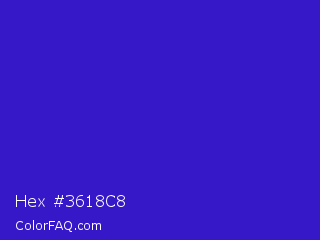 Hex #3618c8 Color is a normal indigo color and the nearest color is Interdimensional Blue #360ccc. Hex code #3618c8 and RGB value is rgb(54,24,200). In RGB color space, this color is composed of 21% red, 9% green, 78% blue, In CMYK color space, this color is composed of 73% cyan, 88% magenta, 0% yellow , 22% black , In HSL color space, this color has a hue angle of 250° , 79% saturation and 44% lightness.