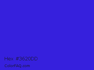 Hex #3620dd Color is a normal indigo color and the nearest color is Interdimensional Blue #360ccc. Hex code #3620dd and RGB value is rgb(54,32,221). In RGB color space, this color is composed of 21% red, 13% green, 87% blue, In CMYK color space, this color is composed of 76% cyan, 86% magenta, 0% yellow , 13% black , In HSL color space, this color has a hue angle of 247° , 75% saturation and 50% lightness.