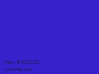 Hex #3622cd Color is a normal indigo color and the nearest color is Interdimensional Blue #360ccc. Hex code #3622cd and RGB value is rgb(54,34,205). In RGB color space, this color is composed of 21% red, 13% green, 80% blue, In CMYK color space, this color is composed of 74% cyan, 83% magenta, 0% yellow , 20% black , In HSL color space, this color has a hue angle of 247° , 72% saturation and 47% lightness.