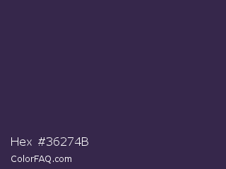 Hex #36274b Color is a very dark violet color and the nearest color is Martinique #363050. Hex code #36274b and RGB value is rgb(54,39,75). In RGB color space, this color is composed of 21% red, 15% green, 29% blue, In CMYK color space, this color is composed of 28% cyan, 48% magenta, 0% yellow , 71% black , In HSL color space, this color has a hue angle of 265° , 32% saturation and 22% lightness.