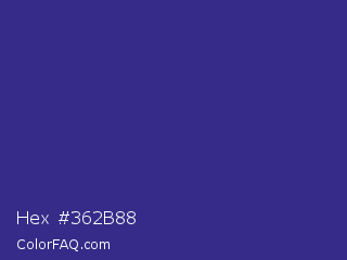 Hex #362b88 Color is a normal indigo color and the nearest color is Cosmic Cobalt #2e2d88. Hex code #362b88 and RGB value is rgb(54,43,136). In RGB color space, this color is composed of 21% red, 17% green, 53% blue, In CMYK color space, this color is composed of 60% cyan, 68% magenta, 0% yellow , 47% black , In HSL color space, this color has a hue angle of 247° , 52% saturation and 35% lightness.