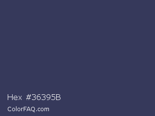 Hex #36395b Color is a dark blue color and the nearest color is Rhino #2e3f62. Hex code #36395b and RGB value is rgb(54,57,91). In RGB color space, this color is composed of 21% red, 22% green, 36% blue, In CMYK color space, this color is composed of 41% cyan, 37% magenta, 0% yellow , 64% black , In HSL color space, this color has a hue angle of 235° , 26% saturation and 28% lightness.