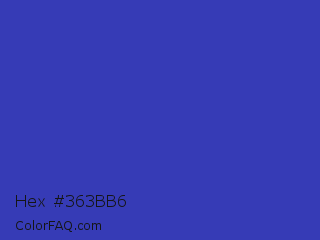 Hex #363bb6 Color is a normal blue color and the nearest color is Governor Bay #2f3cb3. Hex code #363bb6 and RGB value is rgb(54,59,182). In RGB color space, this color is composed of 21% red, 23% green, 71% blue, In CMYK color space, this color is composed of 70% cyan, 68% magenta, 0% yellow , 29% black , In HSL color space, this color has a hue angle of 238° , 54% saturation and 46% lightness.