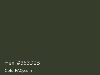 Hex #363d2b Color is a very dark green color and the nearest color is Kombu Green #354230. Hex code #363d2b and RGB value is rgb(54,61,43). In RGB color space, this color is composed of 21% red, 24% green, 17% blue, In CMYK color space, this color is composed of 11% cyan, 0% magenta, 30% yellow , 76% black , In HSL color space, this color has a hue angle of 83° , 17% saturation and 20% lightness.