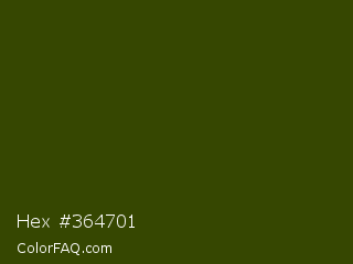 Hex #364701 Color is a very dark lime color and the nearest color is Clover #384910. Hex code #364701 and RGB value is rgb(54,71,1). In RGB color space, this color is composed of 21% red, 28% green, 0% blue, In CMYK color space, this color is composed of 24% cyan, 0% magenta, 99% yellow , 72% black , In HSL color space, this color has a hue angle of 75° , 97% saturation and 14% lightness.
