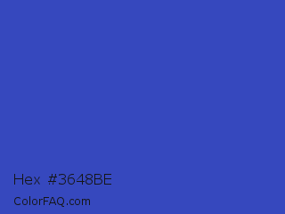 Hex #3648be Color is a normal blue color and the nearest color is Violet Blue #324ab2. Hex code #3648be and RGB value is rgb(54,72,190). In RGB color space, this color is composed of 21% red, 28% green, 75% blue, In CMYK color space, this color is composed of 72% cyan, 62% magenta, 0% yellow , 25% black , In HSL color space, this color has a hue angle of 232° , 56% saturation and 48% lightness.
