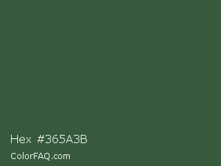 Hex #365a3b Color is a dark green color and the nearest color is Hunter Green #355e3b. Hex code #365a3b and RGB value is rgb(54,90,59). In RGB color space, this color is composed of 21% red, 35% green, 23% blue, In CMYK color space, this color is composed of 40% cyan, 0% magenta, 34% yellow , 65% black , In HSL color space, this color has a hue angle of 128° , 25% saturation and 28% lightness.