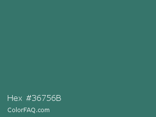 Hex #36756b Color is a normal cyan color and the nearest color is Myrtle Green #317873. Hex code #36756b and RGB value is rgb(54,117,107). In RGB color space, this color is composed of 21% red, 46% green, 42% blue, In CMYK color space, this color is composed of 54% cyan, 0% magenta, 9% yellow , 54% black , In HSL color space, this color has a hue angle of 170° , 37% saturation and 34% lightness.