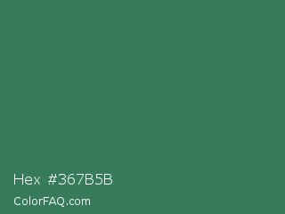 Hex #367b5b Color is a normal green color and the nearest color is Amazon #3b7a57. Hex code #367b5b and RGB value is rgb(54,123,91). In RGB color space, this color is composed of 21% red, 48% green, 36% blue, In CMYK color space, this color is composed of 56% cyan, 0% magenta, 26% yellow , 52% black , In HSL color space, this color has a hue angle of 152° , 39% saturation and 35% lightness.