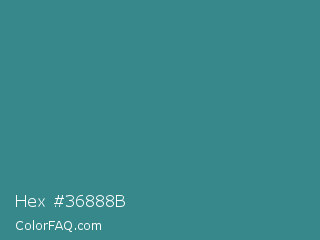 Hex #36888b Color is a normal cyan color and the nearest color is Lochinvar #2c8c84. Hex code #36888b and RGB value is rgb(54,136,139). In RGB color space, this color is composed of 21% red, 53% green, 55% blue, In CMYK color space, this color is composed of 61% cyan, 2% magenta, 0% yellow , 45% black , In HSL color space, this color has a hue angle of 182° , 44% saturation and 38% lightness.