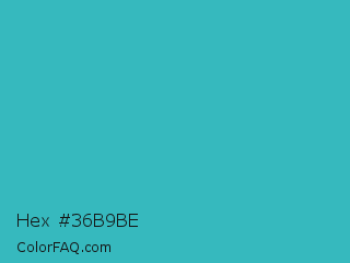 Hex #36b9be Color is a normal cyan color and the nearest color is Maximum Blue Green #30bfbf. Hex code #36b9be and RGB value is rgb(54,185,190). In RGB color space, this color is composed of 21% red, 73% green, 75% blue, In CMYK color space, this color is composed of 72% cyan, 3% magenta, 0% yellow , 25% black , In HSL color space, this color has a hue angle of 182° , 56% saturation and 48% lightness.