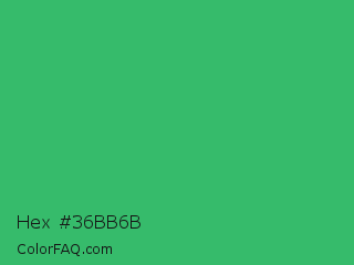 Hex #36bb6b Color is a normal green color and the nearest color is Medium Sea Green #3cb371. Hex code #36bb6b and RGB value is rgb(54,187,107). In RGB color space, this color is composed of 21% red, 73% green, 42% blue, In CMYK color space, this color is composed of 71% cyan, 0% magenta, 43% yellow , 27% black , In HSL color space, this color has a hue angle of 144° , 55% saturation and 47% lightness.