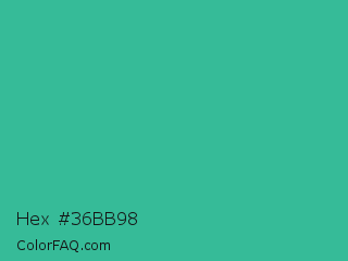 Hex #36bb98 Color is a normal cyan color and the nearest color is Mountain Meadow #30ba8f. Hex code #36bb98 and RGB value is rgb(54,187,152). In RGB color space, this color is composed of 21% red, 73% green, 60% blue, In CMYK color space, this color is composed of 71% cyan, 0% magenta, 19% yellow , 27% black , In HSL color space, this color has a hue angle of 164° , 55% saturation and 47% lightness.