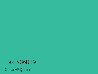 Hex #36bb9e Color is a normal cyan color and the nearest color is Keppel #3ab09e. Hex code #36bb9e and RGB value is rgb(54,187,158). In RGB color space, this color is composed of 21% red, 73% green, 62% blue, In CMYK color space, this color is composed of 71% cyan, 0% magenta, 16% yellow , 27% black , In HSL color space, this color has a hue angle of 167° , 55% saturation and 47% lightness.