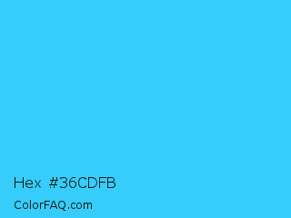 Hex #36cdfb Color is a normal blue color and the nearest color is Picton Blue #45b1e8. Hex code #36cdfb and RGB value is rgb(54,205,251). In RGB color space, this color is composed of 21% red, 80% green, 98% blue, In CMYK color space, this color is composed of 78% cyan, 18% magenta, 0% yellow , 2% black , In HSL color space, this color has a hue angle of 194° , 96% saturation and 60% lightness.