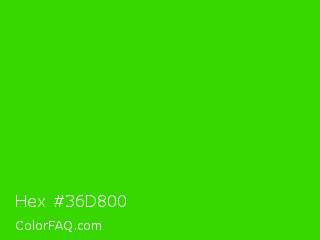 Hex #36d800 Color is a normal green color and the nearest color is Harlequin Green #46cb18. Hex code #36d800 and RGB value is rgb(54,216,0). In RGB color space, this color is composed of 21% red, 85% green, 0% blue, In CMYK color space, this color is composed of 75% cyan, 0% magenta, 100% yellow , 15% black , In HSL color space, this color has a hue angle of 105° , 100% saturation and 42% lightness.