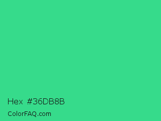 Hex #36db8b Color is a normal green color and the nearest color is Shamrock #33cc99. Hex code #36db8b and RGB value is rgb(54,219,139). In RGB color space, this color is composed of 21% red, 86% green, 55% blue, In CMYK color space, this color is composed of 75% cyan, 0% magenta, 37% yellow , 14% black , In HSL color space, this color has a hue angle of 151° , 70% saturation and 54% lightness.