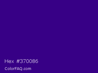 Hex #370086 Color is a dark violet color and the nearest color is Kingfisher Daisy #3e0480. Hex code #370086 and RGB value is rgb(55,0,134). In RGB color space, this color is composed of 22% red, 0% green, 53% blue, In CMYK color space, this color is composed of 59% cyan, 100% magenta, 0% yellow , 47% black , In HSL color space, this color has a hue angle of 265° , 100% saturation and 26% lightness.