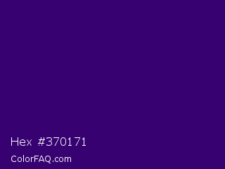 Hex #370171 Color is a very dark violet color and the nearest color is Blue Diamond #380474. Hex code #370171 and RGB value is rgb(55,1,113). In RGB color space, this color is composed of 22% red, 0% green, 44% blue, In CMYK color space, this color is composed of 51% cyan, 99% magenta, 0% yellow , 56% black , In HSL color space, this color has a hue angle of 269° , 98% saturation and 22% lightness.