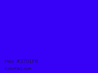 Hex #3701f8 Color is a normal indigo color and the nearest color is Electric Ultramarine #3f00ff. Hex code #3701f8 and RGB value is rgb(55,1,248). In RGB color space, this color is composed of 22% red, 0% green, 97% blue, In CMYK color space, this color is composed of 78% cyan, 100% magenta, 0% yellow , 3% black , In HSL color space, this color has a hue angle of 253° , 99% saturation and 49% lightness.