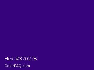 Hex #37027b Color is a dark violet color and the nearest color is Blue Diamond #380474. Hex code #37027b and RGB value is rgb(55,2,123). In RGB color space, this color is composed of 22% red, 1% green, 48% blue, In CMYK color space, this color is composed of 55% cyan, 98% magenta, 0% yellow , 52% black , In HSL color space, this color has a hue angle of 266° , 97% saturation and 25% lightness.