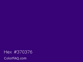 Hex #370376 Color is a dark violet color and the nearest color is Blue Diamond #380474. Hex code #370376 and RGB value is rgb(55,3,118). In RGB color space, this color is composed of 22% red, 1% green, 46% blue, In CMYK color space, this color is composed of 53% cyan, 97% magenta, 0% yellow , 54% black , In HSL color space, this color has a hue angle of 267° , 95% saturation and 24% lightness.