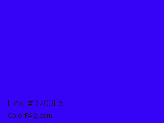 Hex #3703f6 Color is a normal indigo color and the nearest color is Electric Ultramarine #3f00ff. Hex code #3703f6 and RGB value is rgb(55,3,246). In RGB color space, this color is composed of 22% red, 1% green, 96% blue, In CMYK color space, this color is composed of 78% cyan, 99% magenta, 0% yellow , 4% black , In HSL color space, this color has a hue angle of 253° , 98% saturation and 49% lightness.
