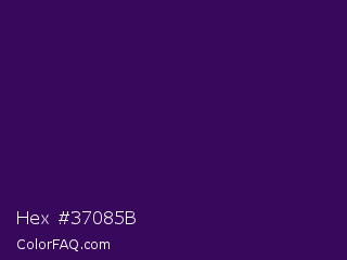 Hex #37085b Color is a very dark purple color and the nearest color is Jagger #350e57. Hex code #37085b and RGB value is rgb(55,8,91). In RGB color space, this color is composed of 22% red, 3% green, 36% blue, In CMYK color space, this color is composed of 40% cyan, 91% magenta, 0% yellow , 64% black , In HSL color space, this color has a hue angle of 274° , 84% saturation and 19% lightness.
