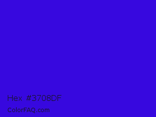 Hex #3708df Color is a normal indigo color and the nearest color is Interdimensional Blue #360ccc. Hex code #3708df and RGB value is rgb(55,8,223). In RGB color space, this color is composed of 22% red, 3% green, 87% blue, In CMYK color space, this color is composed of 75% cyan, 96% magenta, 0% yellow , 13% black , In HSL color space, this color has a hue angle of 253° , 93% saturation and 45% lightness.