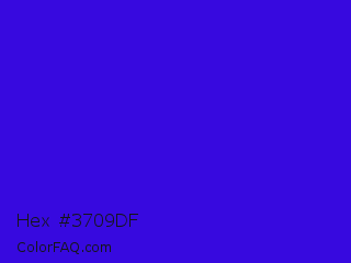 Hex #3709df Color is a normal indigo color and the nearest color is Interdimensional Blue #360ccc. Hex code #3709df and RGB value is rgb(55,9,223). In RGB color space, this color is composed of 22% red, 4% green, 87% blue, In CMYK color space, this color is composed of 75% cyan, 96% magenta, 0% yellow , 13% black , In HSL color space, this color has a hue angle of 253° , 92% saturation and 45% lightness.