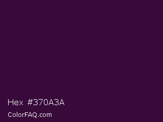 Hex #370a3a Color is a very dark magenta color and the nearest color is Valentino #350e42. Hex code #370a3a and RGB value is rgb(55,10,58). In RGB color space, this color is composed of 22% red, 4% green, 23% blue, In CMYK color space, this color is composed of 5% cyan, 83% magenta, 0% yellow , 77% black , In HSL color space, this color has a hue angle of 296° , 71% saturation and 13% lightness.