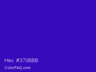 Hex #370bbb Color is a normal indigo color and the nearest color is Interdimensional Blue #360ccc. Hex code #370bbb and RGB value is rgb(55,11,187). In RGB color space, this color is composed of 22% red, 4% green, 73% blue, In CMYK color space, this color is composed of 71% cyan, 94% magenta, 0% yellow , 27% black , In HSL color space, this color has a hue angle of 255° , 89% saturation and 39% lightness.