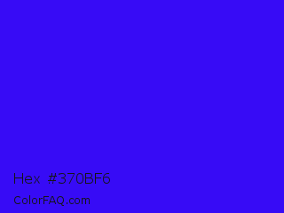 Hex #370bf6 Color is a normal indigo color and the nearest color is Electric Ultramarine #3f00ff. Hex code #370bf6 and RGB value is rgb(55,11,246). In RGB color space, this color is composed of 22% red, 4% green, 96% blue, In CMYK color space, this color is composed of 78% cyan, 96% magenta, 0% yellow , 4% black , In HSL color space, this color has a hue angle of 251° , 93% saturation and 50% lightness.