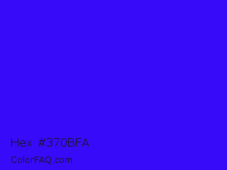 Hex #370bfa Color is a normal indigo color and the nearest color is Electric Ultramarine #3f00ff. Hex code #370bfa and RGB value is rgb(55,11,250). In RGB color space, this color is composed of 22% red, 4% green, 98% blue, In CMYK color space, this color is composed of 78% cyan, 96% magenta, 0% yellow , 2% black , In HSL color space, this color has a hue angle of 251° , 96% saturation and 51% lightness.
