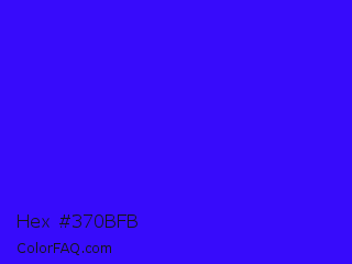 Hex #370bfb Color is a normal indigo color and the nearest color is Electric Ultramarine #3f00ff. Hex code #370bfb and RGB value is rgb(55,11,251). In RGB color space, this color is composed of 22% red, 4% green, 98% blue, In CMYK color space, this color is composed of 78% cyan, 96% magenta, 0% yellow , 2% black , In HSL color space, this color has a hue angle of 251° , 97% saturation and 51% lightness.