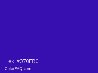 Hex #370eb0 Color is a normal indigo color and the nearest color is Interdimensional Blue #360ccc. Hex code #370eb0 and RGB value is rgb(55,14,176). In RGB color space, this color is composed of 22% red, 5% green, 69% blue, In CMYK color space, this color is composed of 69% cyan, 92% magenta, 0% yellow , 31% black , In HSL color space, this color has a hue angle of 255° , 85% saturation and 37% lightness.