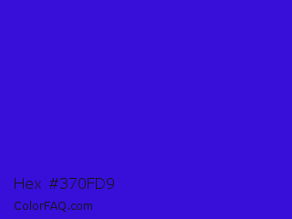 Hex #370fd9 Color is a normal indigo color and the nearest color is Interdimensional Blue #360ccc. Hex code #370fd9 and RGB value is rgb(55,15,217). In RGB color space, this color is composed of 22% red, 6% green, 85% blue, In CMYK color space, this color is composed of 75% cyan, 93% magenta, 0% yellow , 15% black , In HSL color space, this color has a hue angle of 252° , 87% saturation and 45% lightness.