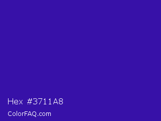 Hex #3711a8 Color is a normal indigo color and the nearest color is Blue Gem #2c0e8c. Hex code #3711a8 and RGB value is rgb(55,17,168). In RGB color space, this color is composed of 22% red, 7% green, 66% blue, In CMYK color space, this color is composed of 67% cyan, 90% magenta, 0% yellow , 34% black , In HSL color space, this color has a hue angle of 255° , 82% saturation and 36% lightness.