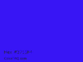Hex #3715f4 Color is a normal indigo color and the nearest color is Electric Ultramarine #3f00ff. Hex code #3715f4 and RGB value is rgb(55,21,244). In RGB color space, this color is composed of 22% red, 8% green, 96% blue, In CMYK color space, this color is composed of 77% cyan, 91% magenta, 0% yellow , 4% black , In HSL color space, this color has a hue angle of 249° , 91% saturation and 52% lightness.