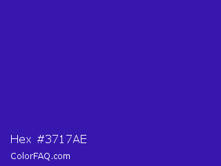 Hex #3717ae Color is a normal indigo color and the nearest color is Interdimensional Blue #360ccc. Hex code #3717ae and RGB value is rgb(55,23,174). In RGB color space, this color is composed of 22% red, 9% green, 68% blue, In CMYK color space, this color is composed of 68% cyan, 87% magenta, 0% yellow , 32% black , In HSL color space, this color has a hue angle of 253° , 77% saturation and 39% lightness.