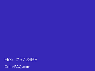 Hex #3728b8 Color is a normal indigo color and the nearest color is Governor Bay #2f3cb3. Hex code #3728b8 and RGB value is rgb(55,40,184). In RGB color space, this color is composed of 22% red, 16% green, 72% blue, In CMYK color space, this color is composed of 70% cyan, 78% magenta, 0% yellow , 28% black , In HSL color space, this color has a hue angle of 246° , 64% saturation and 44% lightness.