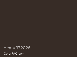 Hex #372c26 Color is a very dark orange color and the nearest color is Birch #373021. Hex code #372c26 and RGB value is rgb(55,44,38). In RGB color space, this color is composed of 22% red, 17% green, 15% blue, In CMYK color space, this color is composed of 0% cyan, 20% magenta, 31% yellow , 78% black , In HSL color space, this color has a hue angle of 21° , 18% saturation and 18% lightness.