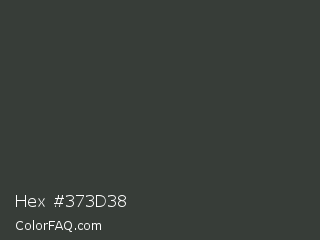 Hex #373d38 Color is a dark green color and the nearest color is Black Olive #3b3c36. Hex code #373d38 and RGB value is rgb(55,61,56). In RGB color space, this color is composed of 22% red, 24% green, 22% blue, In CMYK color space, this color is composed of 10% cyan, 0% magenta, 8% yellow , 76% black , In HSL color space, this color has a hue angle of 130° , 5% saturation and 23% lightness.